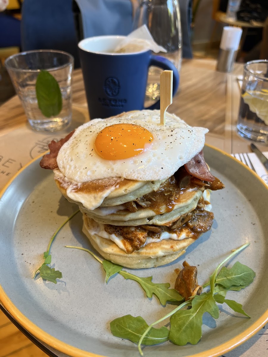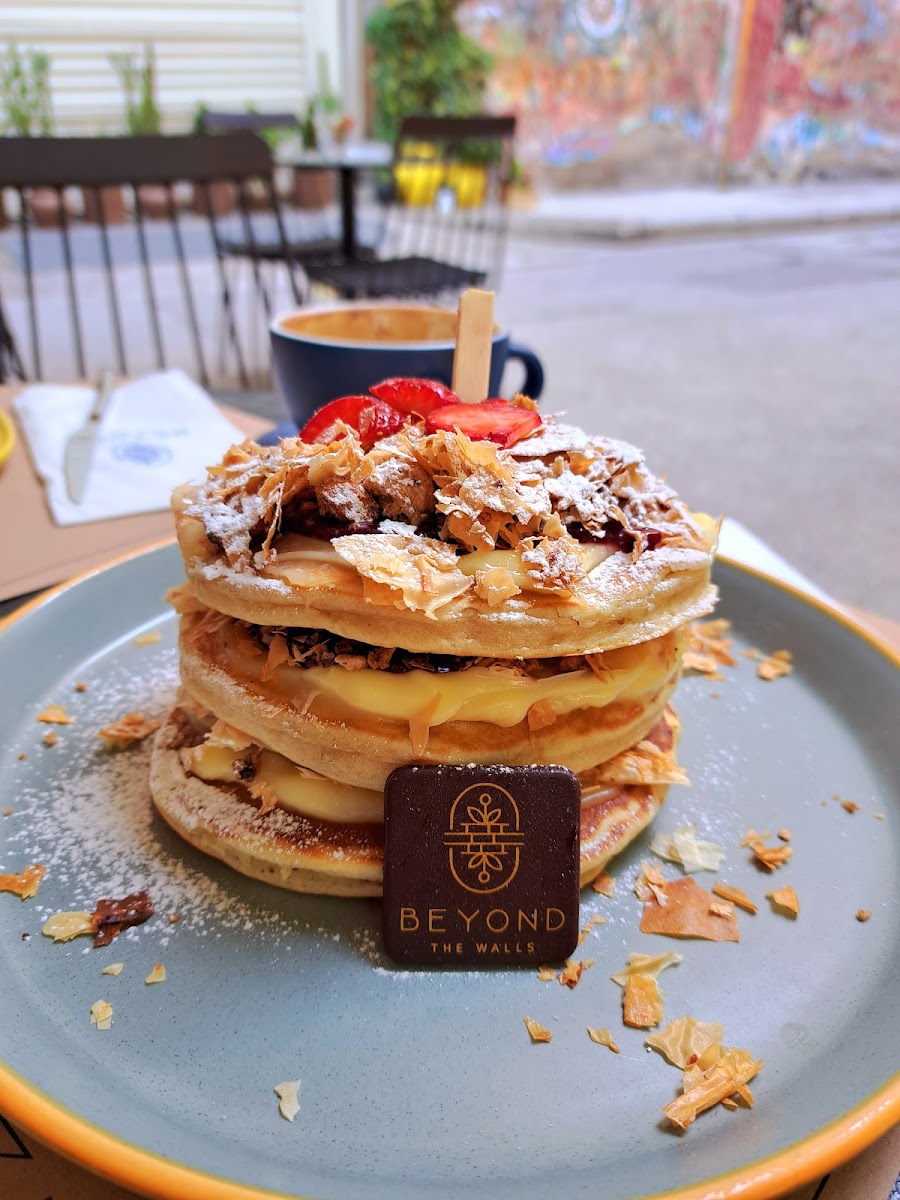 As far as brunch goes in Thessaloniki, this is definitely one of the best you can go to. I would confidently say that the atmosphere here is top tier. Whether you to sit outside next to the old Byzantine ruins or inside in the modern and elegant space, it provides a different but in both cases great and pleasant atmosphere. The service was great with one or two minor hiccups. It was fast, helpful and respectful! The food was great, I got savoury pancakes that were very fluffy and light, with a delicious truffle infused cream and mushrooms. My white cold chocolate was not the best however, I ordered one with mastic and rose , and I imagine due to it being cold, it had been diluted by the ice, and the flavours were a bit numb, with the rose being almost completely unnoticeable. That being said, it still tasted good, just didn't live up to the same standard as the pancakes. The croissant I got later was alright, it missed the airyness and crispiness of a traditionally great croissant unfortunately, and due to these mishaps I can't give a full 5 star review. Other than that, it was a great place, and I definitely recommend it to anyone who goes to Thessaloniki and wants to have a nice brunch or a coffee in a beautiful atmosphere.